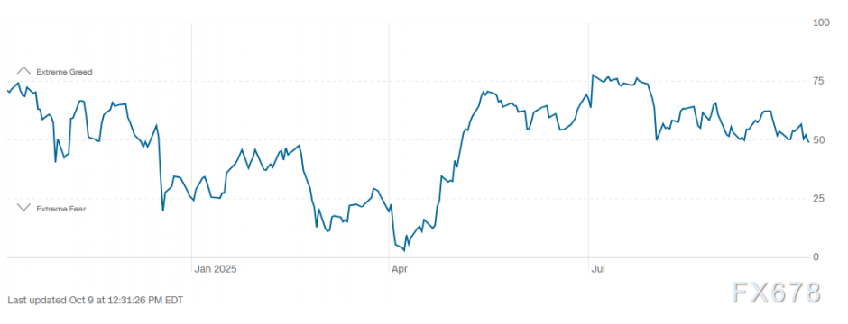 當(dāng)前持續(xù)的美國(guó)政府停擺事件,引發(fā)了人們對(duì)政治和體制風(fēng)險(xiǎn)的擔(dān)憂,略微挫傷了市場(chǎng)信心。這一影響可以在“恐懼與貪婪指數(shù)”中觀察到:市場(chǎng)情緒已呈現(xiàn)穩(wěn)定的下降趨勢(shì),正逼近50點(diǎn)水平,逐漸接近“恐懼”區(qū)間。